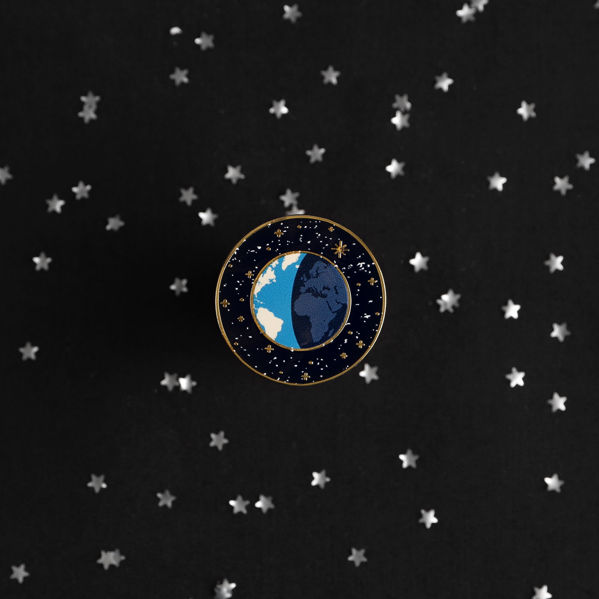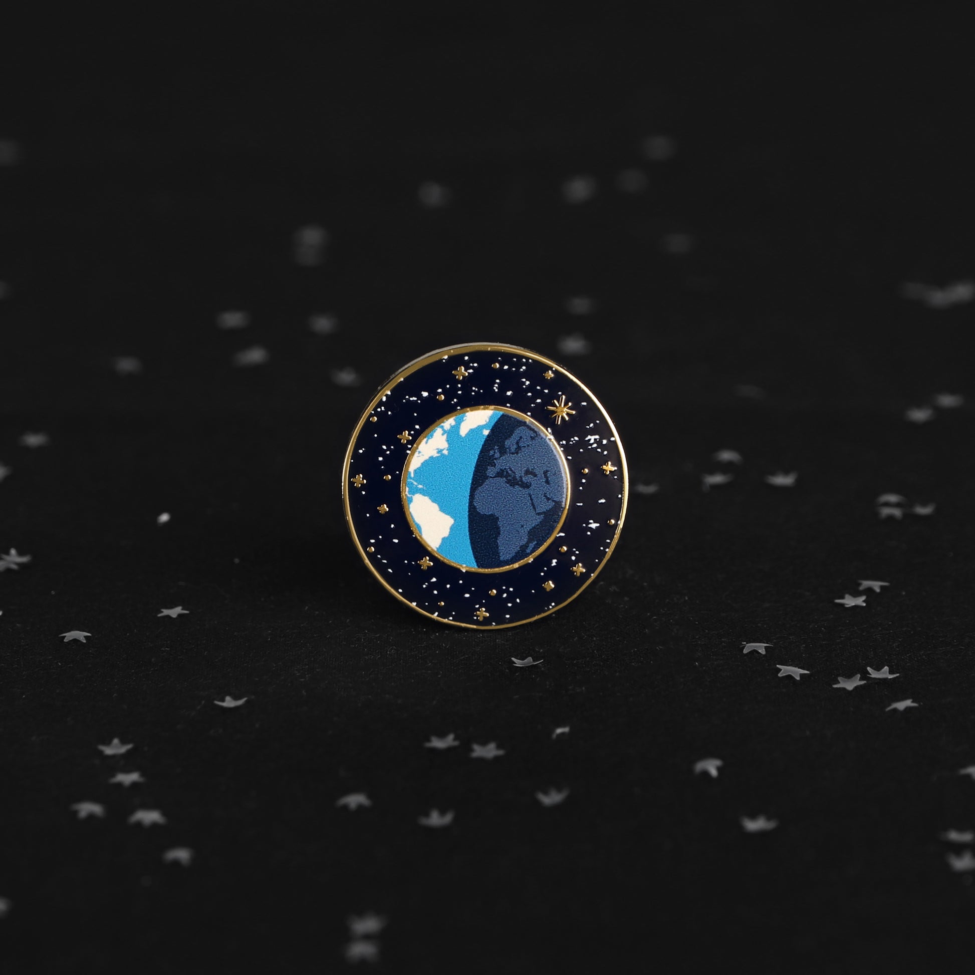 This Earth in Space hard enamel pin captures the enchanting beauty of our planet floating in the cosmos. Gold metal plating outlines the detailed UV-printed Earth, with half the globe gently embraced by shadow. Surrounding gold stars twinkle, evoking the magic and mystery of the universe in a wearable, stunning design.